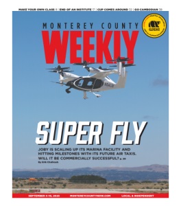 4 MONTEREY COUNTY WEEKLY SEPTEMBER 4-10, 2025 www.montereycountynow.com SEPTEMBER 4-10, 2025 • ISSUE #1936 • ESTABLISHED IN 1988 Jay Edelman (Canon EOS R; 6-second exposure; ISO 100; f/29; 400mm lens) A long camera exposure captures the carnival scene at the Monterey County Fair, which wrapped up its five-day run on Monday, Sept. 1. MONTEREY COUNTY PHOTO OF THE WEEK Send Etc. submissions to etcphoto@montereycountynow.com; please include caption and camera info. On the cover: A Joby aircraft takes flight at the Marina Municipal Airport. The Santa Cruz-based company is manufacturing electric vertical take-off and landing aircraft (eVTOLs) at its facilities in Marina, and hopes to launch commercial service in 2026. Cover image: Daniel Dreifuss etc. Copyright © 2025 by Milestone Communications Inc. 668 Williams Ave., Seaside, California 93955 (telephone 831-394-5656). All rights reserved. Monterey County Weekly, the Best of Monterey County and the Best of Monterey Bay are registered trademarks. No person, without prior permission from the publisher, may take more than one copy of each issue. Additional copies and back issues may be purchased for $1, plus postage. Mailed subscriptions: $300 yearly, prepaid. The Weekly is an adjudicated newspaper of Monterey County, court decree M21137. The Weekly assumes no responsibility for unsolicited materials. Visit our website at http://www.montereycountynow. com. Audited by CVC. FOUNDER & CEO Bradley Zeve bradley@montereycountynow.com (x103) PUBLISHER Erik Cushman erik@montereycountynow.com (x125) EDITORIAL EDITOR Sara Rubin sara@montereycountynow.com (x120) ASSOCIATE EDITOR Erik Chalhoub ec@montereycountynow.com (x135) FEATURES EDITOR Dave Faries dfaries@montereycountynow.com (x110) STAFF WRITER Celia Jiménez celia@montereycountynow.com (x145) STAFF WRITER Pam Marino pam@montereycountynow.com (x106) STAFF WRITER Agata Pope¸da (x138) aga@montereycountynow.com STAFF WRITER Katie Rodriguez (California Local News Fellow) katie@montereycountynow.com (x102) STAFF WRITER David Schmalz david@montereycountynow.com (x104) STAFF PHOTOGRAPHER Daniel Dreifuss daniel@montereycountynow.com (x140) DIGITAL PRODUCER Sloan Campi sloan@montereycountynow.com (x105) CONTRIBUTORS Nik Blaskovich, Rob Brezsny, Robert Daniels, Tonia Eaton, Paul Fried, Jesse Herwitz, Jacqueline Weixel, Paul Wilner CARTOONS Rob Rogers, Tom Tomorrow PRODUCTION ART DIRECTOR/PRODUCTION MANAGER Karen Loutzenheiser karen@montereycountynow.com (x108) GRAPHIC DESIGNER Kevin Jewell kevinj@montereycountynow.com (x114) GRAPHIC DESIGNER Alexis Estrada alexis@montereycountynow.com (x114) GRAPHIC DESIGNER Lani Headley lani@montereycountynow.com (x114) SALES SENIOR SALES EXECUTIVE Diane Glim diane@montereycountynow.com (x124) SENIOR SALES EXECUTIVE George Kassal george@montereycountynow.com (x122) SENIOR SALES EXECUTIVE Keith Bruecker keith@montereycountynow.com (x118) CLASSIFIEDS BUSINESS DEVELOPMENT DIRECTOR Keely Richter keely@montereycountynow.com (x123) DIGITAL DIRECTOR OF DIGITAL MEDIA Kevin Smith kevin@montereycountynow.com (x119) DISTRIBUTION DISTRIBUTION AT Arts Co. atartsco@gmail.com DISTRIBUTION CONTROL Harry Neal BUSINESS/FRONT OFFICE OFFICE MANAGER Linda Maceira linda@montereycountynow.com (x101) BOOKKEEPING Rochelle Trawick 668 Williams Ave., Seaside, CA 93955 831-394-5656, (FAX) 831-394-2909 www.montereycountynow.com We’d love to hear from you. Send us your tips at tipline.montereycountynow.com. Subscribe to the newsletter @ montereycountynow.com/subscribe Go to montereycountynow.com We Deliver… NEWS • ARTS • ENTERTAINMENT FOOD • DRINK • CALENDAR Local news everyday