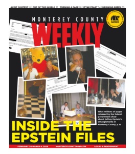 2 MONTEREY COUNTY WEEKLY FEBRUARY 26-MARCH 4, 2026 www.montereycountynow.com FEBRUARY 26-MARCH 4, 2026 • ISSUE #1961 • ESTABLISHED IN 1988 Eden Rue (Cessna airplane at 5,000 feet with an iPhone XS Max) After a series of storms broke, snow blanketed the peaks of the Santa Lucia Mountains on Friday, Feb. 20. MONTEREY COUNTY PHOTO OF THE WEEK Send Etc. submissions to etcphoto@montereycountynow.com; please include caption and camera info. On the cover: The U.S. Department of Justice released more than 3.5 million records related to Jeffrey Epstein. The publicly available trove, collectively known as “the Epstein files,” includes photographs, emails, flight logs and checks, among other things. Cover images: U.S. Department of Justice etc. Copyright © 2026 by Milestone Communications Inc. 668 Williams Ave., Seaside, California 93955 (telephone 831-394-5656). All rights reserved. Monterey County Weekly, the Best of Monterey County and the Best of Monterey Bay are registered trademarks. No person, without prior permission from the publisher, may take more than one copy of each issue. Additional copies and back issues may be purchased for $1, plus postage. Mailed subscriptions: $300 yearly, prepaid. The Weekly is an adjudicated newspaper of Monterey County, court decree M21137. The Weekly assumes no responsibility for unsolicited materials. Visit our website at http://www.montereycountynow. com. Audited by CVC. FOUNDER & CEO Bradley Zeve bradley@montereycountynow.com (x103) PUBLISHER Erik Cushman erik@montereycountynow.com (x125) EDITORIAL EDITOR Sara Rubin sara@montereycountynow.com (x120) ASSOCIATE EDITOR Erik Chalhoub ec@montereycountynow.com (x135) FEATURES EDITOR Dave Faries dfaries@montereycountynow.com (x110) SENIOR STAFF WRITER Pam Marino pam@montereycountynow.com (x106) STAFF WRITER Celia Jiménez celia@montereycountynow.com (x145) STAFF WRITER Agata Pope¸da aga@montereycountynow.com (x138) STAFF WRITER Katie Rodriguez (California Local News Fellow) katie@montereycountynow.com (x102) STAFF WRITER Aric Sleeper aric@montereycountynow.com (x127) STAFF PHOTOGRAPHER Daniel Dreifuss daniel@montereycountynow.com (x140) DIGITAL PRODUCER Sloan Campi sloan@montereycountynow.com (x105) CONTRIBUTORS Nik Blaskovich, Rob Brezsny, Robert Daniels, Tonia Eaton, Jesse Herwitz, Luz Rimban, Jacqueline Weixel, Paul Wilner CARTOONS Rob Rogers, Tom Tomorrow PRODUCTION ART DIRECTOR/PRODUCTION MANAGER Karen Loutzenheiser karen@montereycountynow.com (x108) GRAPHIC DESIGNER Kevin Jewell kevinj@montereycountynow.com (x114) GRAPHIC DESIGNER Annie Cobb annie@montereycountynow.com (x114) GRAPHIC DESIGNER Lani Headley lani@montereycountynow.com (x114) SALES SENIOR SALES EXECUTIVE Diane Glim diane@montereycountynow.com (x124) SENIOR SALES EXECUTIVE George Kassal george@montereycountynow.com (x122) SENIOR SALES EXECUTIVE Keith Bruecker keith@montereycountynow.com (x118) CLASSIFIEDS BUSINESS DEVELOPMENT DIRECTOR Keely Richter keely@montereycountynow.com (x123) DIGITAL DIRECTOR OF DIGITAL MEDIA Kevin Smith kevin@montereycountynow.com (x119) DISTRIBUTION DISTRIBUTION AT Arts Co. atartsco@gmail.com DISTRIBUTION CONTROL Harry Neal BUSINESS/FRONT OFFICE OFFICE MANAGER Linda Maceira linda@montereycountynow.com (x101) BOOKKEEPING Rochelle Trawick 668 Williams Ave., Seaside, CA 93955 831-394-5656, (FAX) 831-394-2909 www.montereycountynow.com We’d love to hear from you. Send us your tips at tipline.montereycountynow.com. NEWS • ARTS • ENTERTAINMENT • FOOD • DRINK • CALENDAR Subscribe to the newsletter @ montereycountynow.com/subscribe READ MORE NOW ONLINE NEWSLETTER Go to montereycountynow.com LOCAL NEWS EVERYDAY AT MONTEREY COUNTY NOW